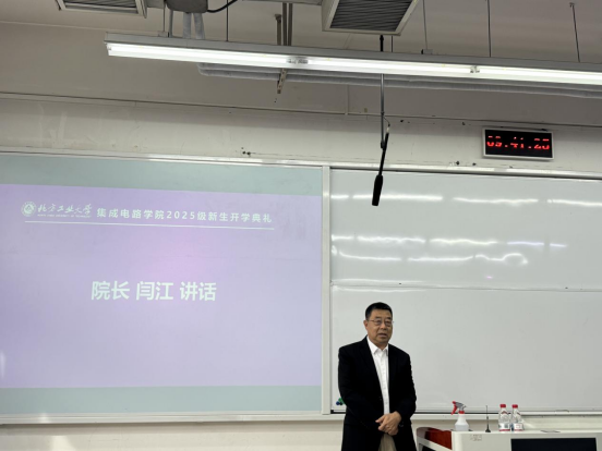 最后,院长闫江教授为全体新生讲授“开学第一课”。他首先对新同学的到来表示热烈欢迎,并以“独立、珍惜、目标”六个字为核心,向新生们寄予深切期望与殷切嘱托:希望同学们在未来的大学生活中,着力培养独立学习、独立思考与独立生活的综合能力;珍惜大学阶段宝贵的学习时光与成长机遇;尽早树立明确的个人发展目标,为深耕集成电路领域打下坚实基础。这番寄语言简意赅,既饱含对新生的关怀,更充满对青年一代投身学科建设的期许。