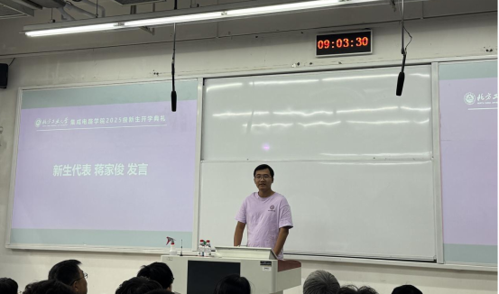 首先,新生代表蒋家俊上台发言,分享入学以来的真切感受,并代表全体新生作出学业承诺,展现出蓬勃的青春朝气。