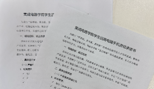 如今,tyc7111cc太阳成集团多措并行:以“规”束行,以“诺”践心,以“我”修身,以“体”砺,无论是《学生“芯”规》的制度划定,还是《远离电脑手机游戏承诺书》的主动约定,核心目标始终一致——引导“芯青年”远离干扰、专注学业,以实际行动践行“芯片报国”的使命。集电学子正以“芯”规为行为标尺,以承诺为自律动力,主动减少游戏时间、聚焦专业学习,在课堂上认真思考、在实验室里钻研创新,在“芯火相传、强基铸魂”的育人氛围中,为未来投身集成电路事业、助力国家科技自立自强筑牢根基。