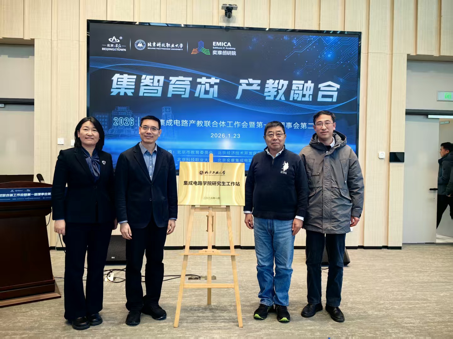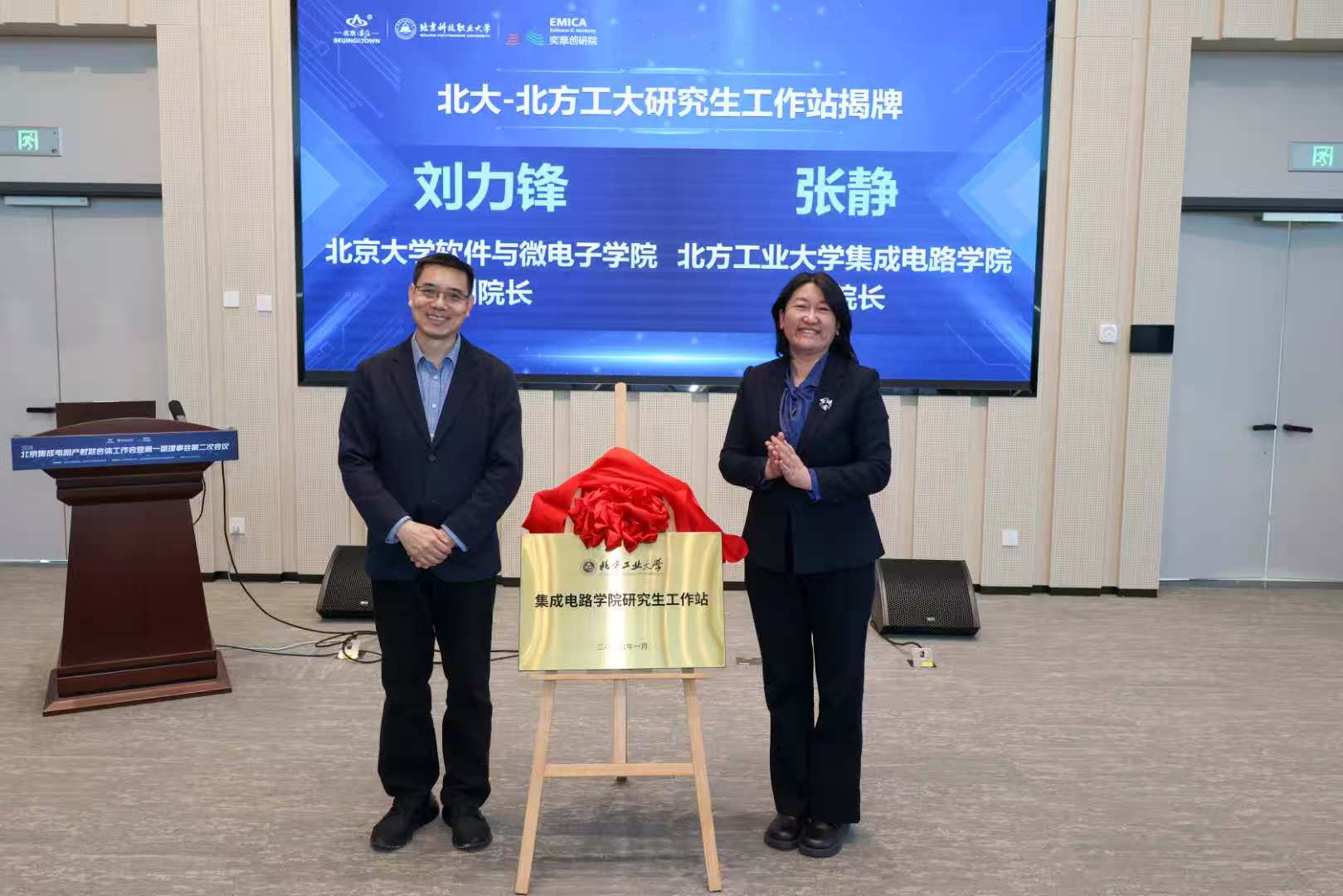 在此次会议上,我校tyc7111cc太阳成集团与北京大学tyc7111cc太阳成集团以“1+1”共建的形式入驻北京集成电路产教融合基地,并共建研究生工作站。北京大学软件与微电子学院副院长刘力锋和我校tyc7111cc太阳成集团副院长张静共同为太阳成tyc7111cc产教融合基地和研究生工作站揭牌。学院还与胜科纳米科技(北京)有限公司进行了就业实践实习基地的揭牌仪式。