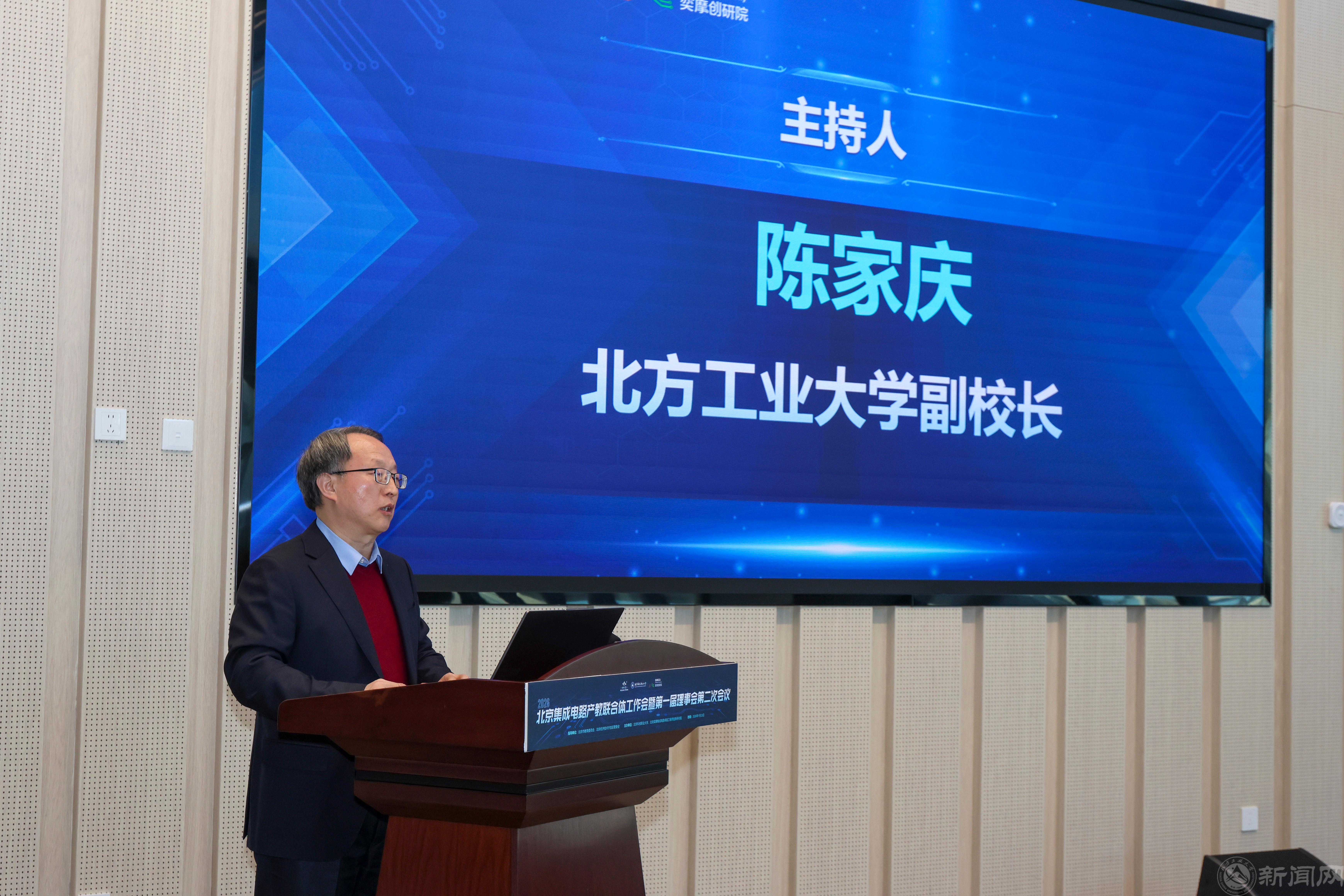 1月23日,北京集成电路产教联合体2026年度工作大会暨第一届理事会第二次会议在北京集成电路产教融合基地隆重举行。北京市委教育工委委员、北京市教育委员会副主任张耀天,北京经济技术开发区管委会副主任沈金坤,北京科技职业大学校长王伟,太阳成tyc7111cc党委常委、副校长陈家庆出席。来自北京航空航天大学、北京理工大学、太阳成tyc7111cc等10所联合体高校集成电路相关院系的负责人,以及北方集成电路创新中心、北方华创、中芯国际等20余家联合体建设参与企业的负责人参加会议。陈家庆作为首届轮值理事长单位的与会领导,主持了第一个环节的会议。