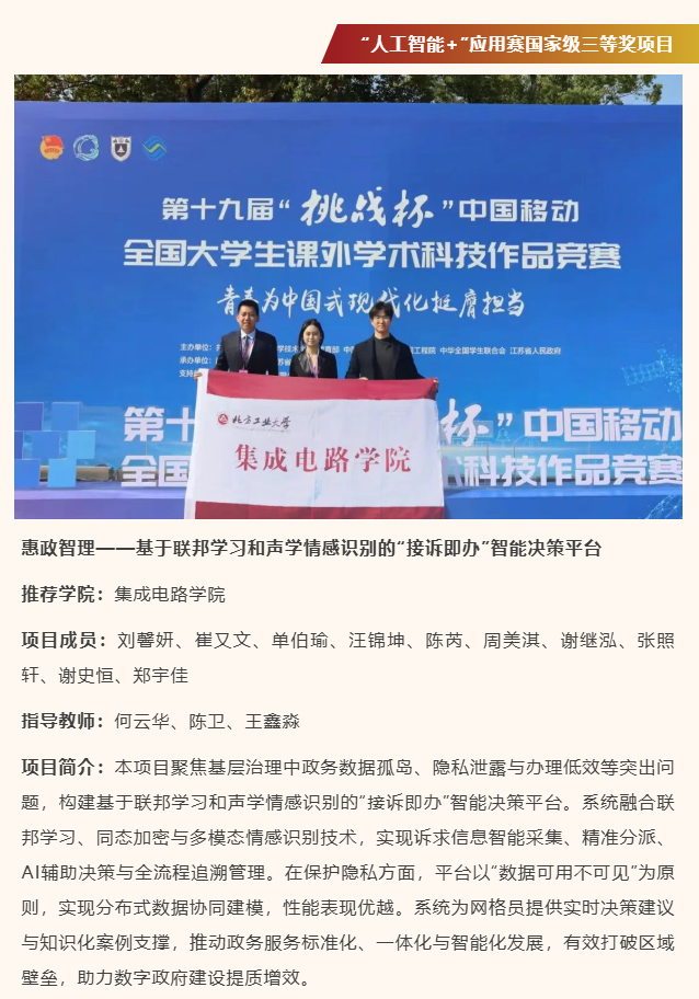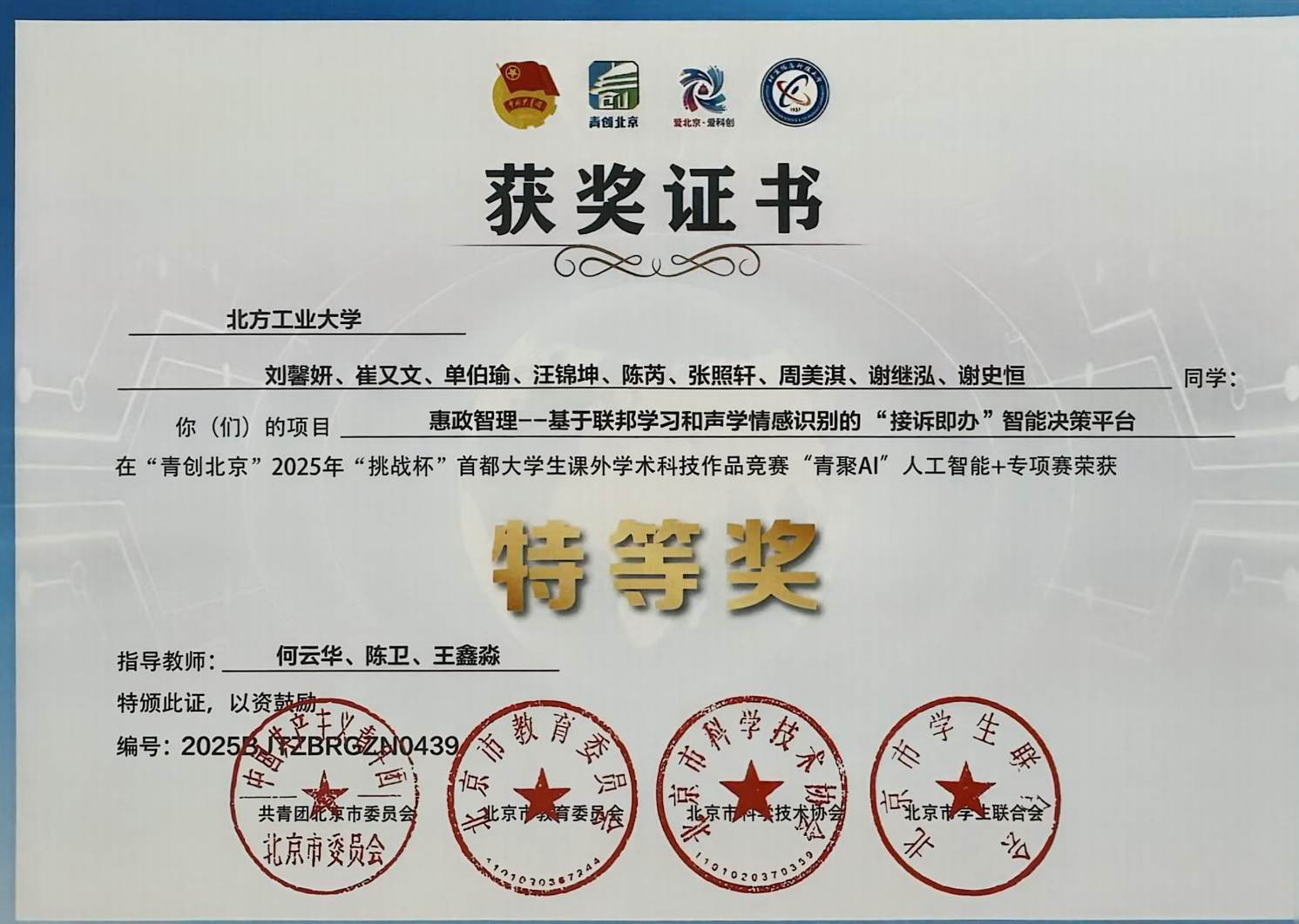 tyc7111cc太阳成集团优秀学子获得“青创北京”2025年“挑战杯”首都大学生课外学术科技作品竞赛“青聚AI”人工智能+专项赛,特等奖1项:
